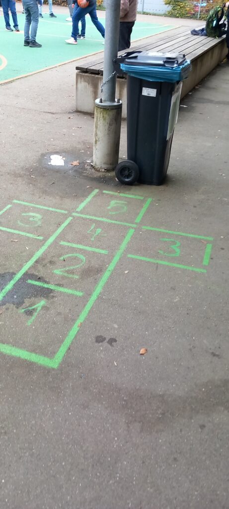 Auch das Hüpfspiel im A-Hof direkt vor den Kunsträumen findet sie eine gute Idee, da es die Schüler motivieren soll. Dadurch dass diese nun auch noch das Hüpfspiel benutzen könnten, würde das Müllentsorgen nun sogar auch Spaß machen.