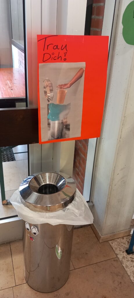 Die Klasse 9c hat sich im Wirtschaftsunterricht mit dem Thema „Nudging“ beschäftigt. Nudging hat das Ziel gezielt das Verhalten von Menschen ohne Druck und Verbote zu ändern. Als kleines Projekt hat die Klasse mit Frau Dördelmann dann die vielen Schilder gestaltet. Die Schilder also die Nudges sollen das Verhalten der Schüler ändern und auf eine spezielle Art verursachen, dass Schüler ihren Müll ordnungsgemäß entsorgen. Außerdem soll es natürlich die Umwelt schützen, dass der Müll z.B. nicht ins Abwasser gelangt und dass die Gesamtkosten für das Müll- entfernen verringert werden, sodass der Hausmeister nicht so viel Arbeit hat.